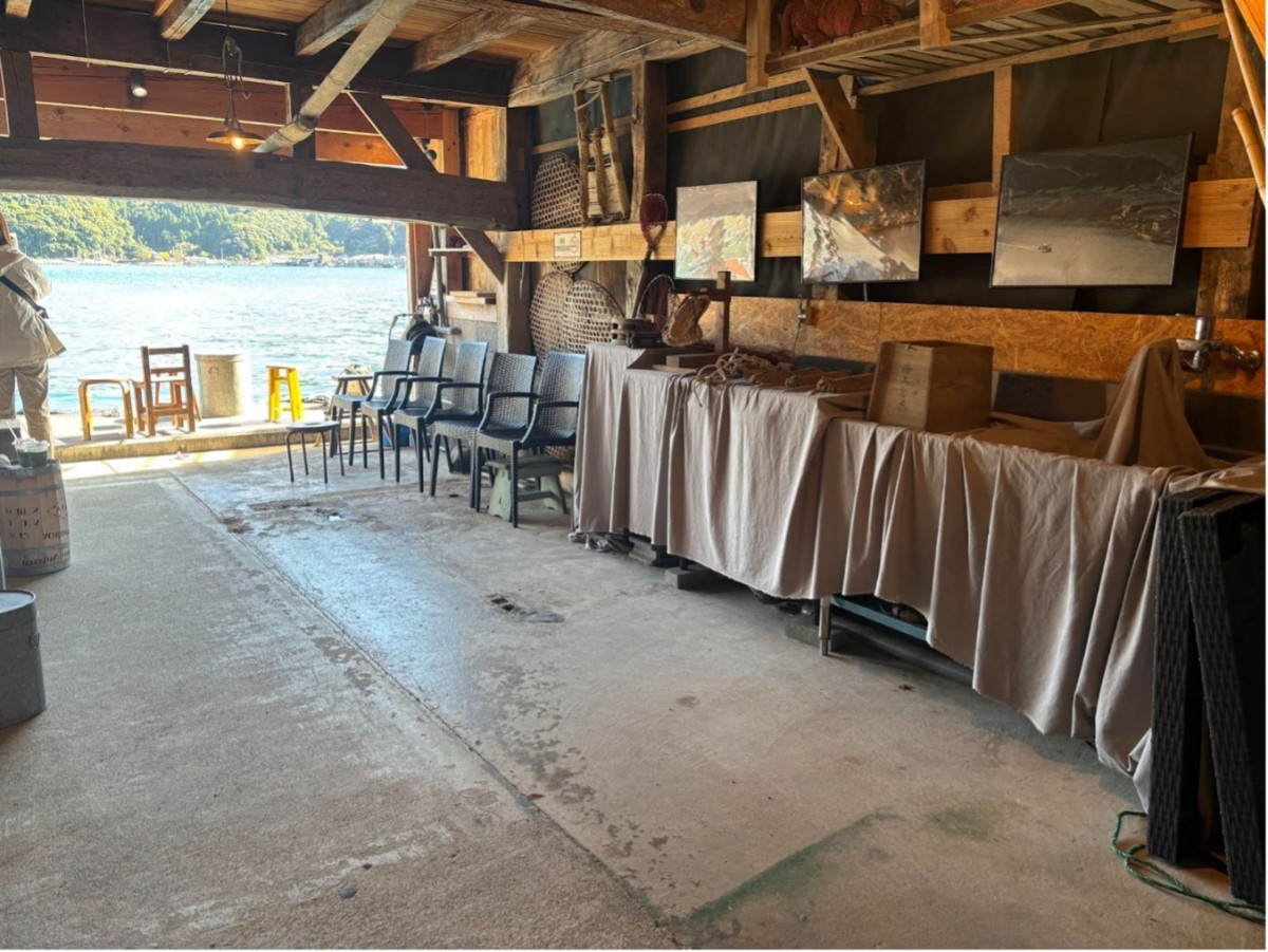 海上タクシー「Re:ine」寺谷僚介さんの舟屋。ここで過ごしたり、コーヒーを持ったまま遊覧船に乗ったりできる