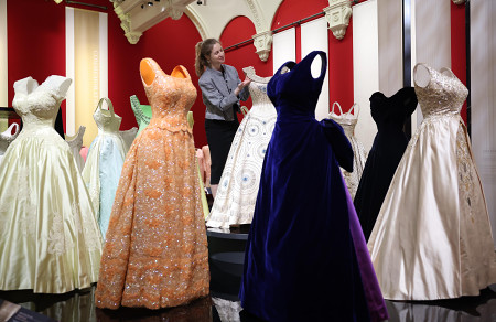 9日、ロンドンのバッキンガム宮殿のギャラリーに並ぶきらびやかなドレスの数々。故エリザベス英女王のファッションをテーマとした展覧会に向け、女王が身に着けていた衣装や装飾品がお披露目の時を待っている。 【EPA時事】