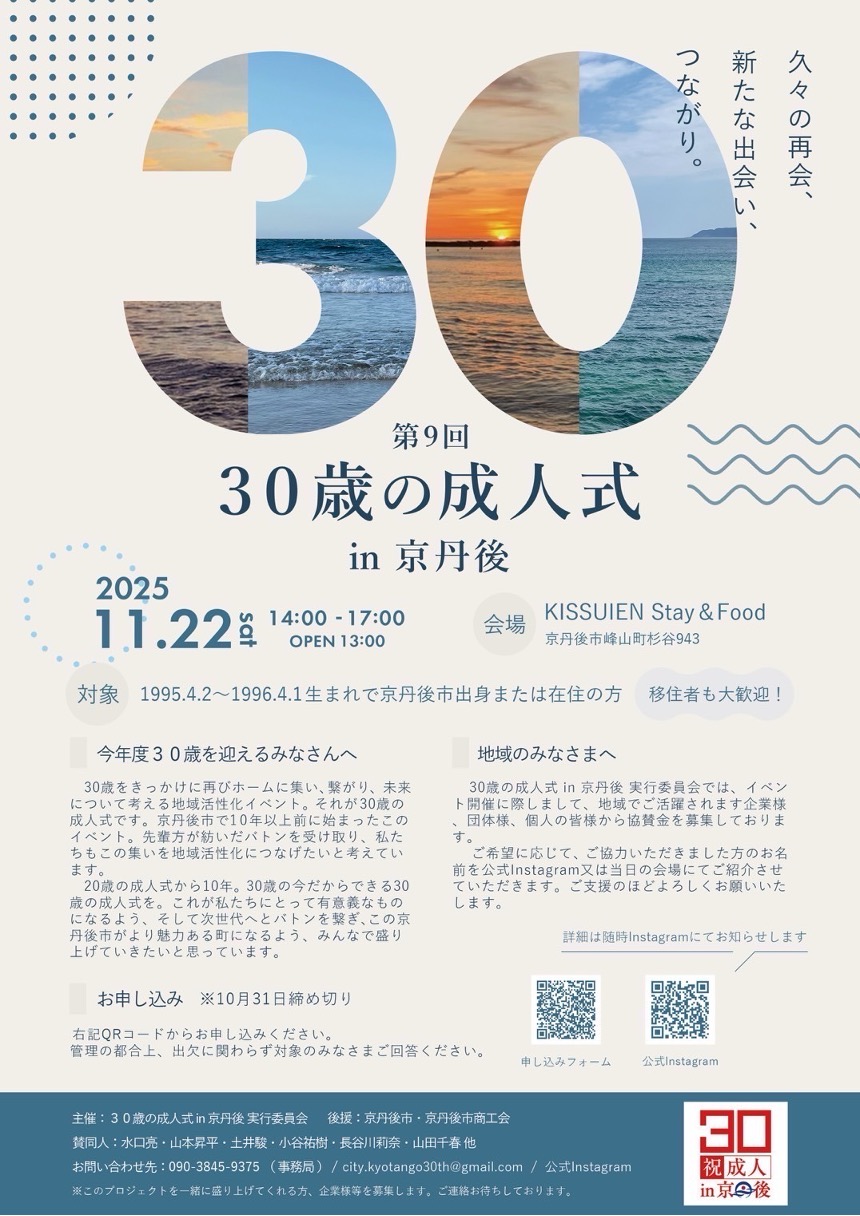 30歳を本当の成人と捉えるイベント「30歳の成人式in京丹後」が11月22日、「KISSUIEN Stay & Food」(京丹後市峰山町)で開催される。